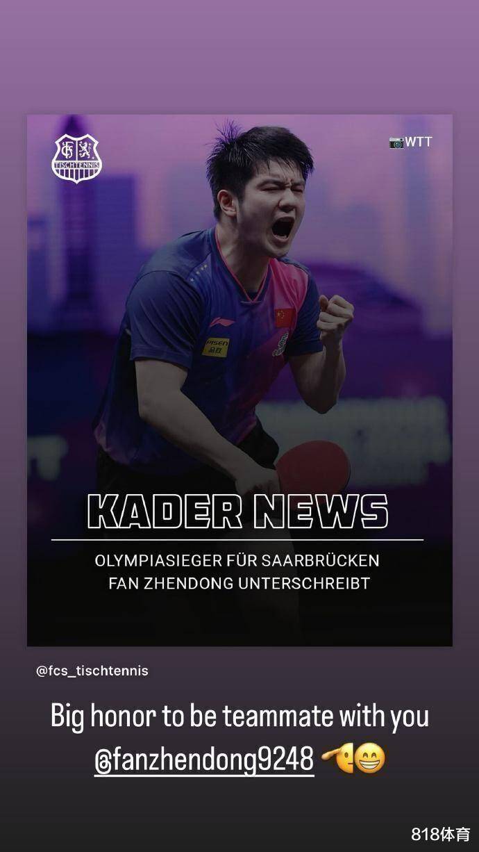 6月1日,28岁的樊振东正式加入德甲萨尔布吕肯,签下为期一年的合同。在新赛季中,他将与欧洲的顶级球员如莫雷加德、弗朗西斯卡等并肩作战。樊振东将代表球队参加德甲联赛(并非全部场次)、德国杯以及欧冠赛事。