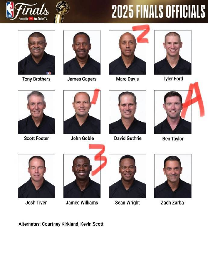 北京时间2025年6月17日,NBA总决赛雷霆与步行者的第五战将于今日开打。赛前,NBA官方公布了本场比赛的裁判员名单。